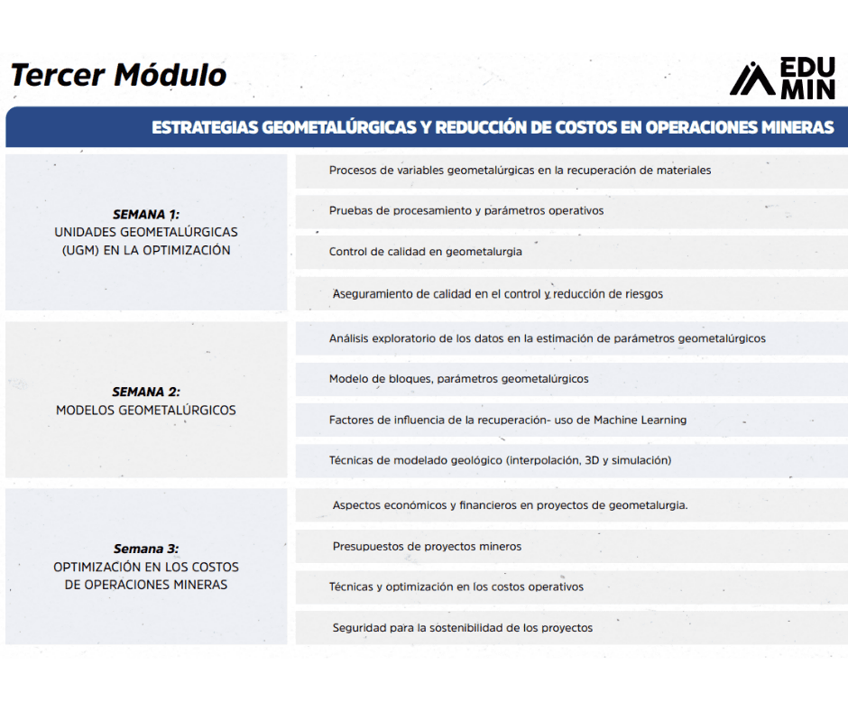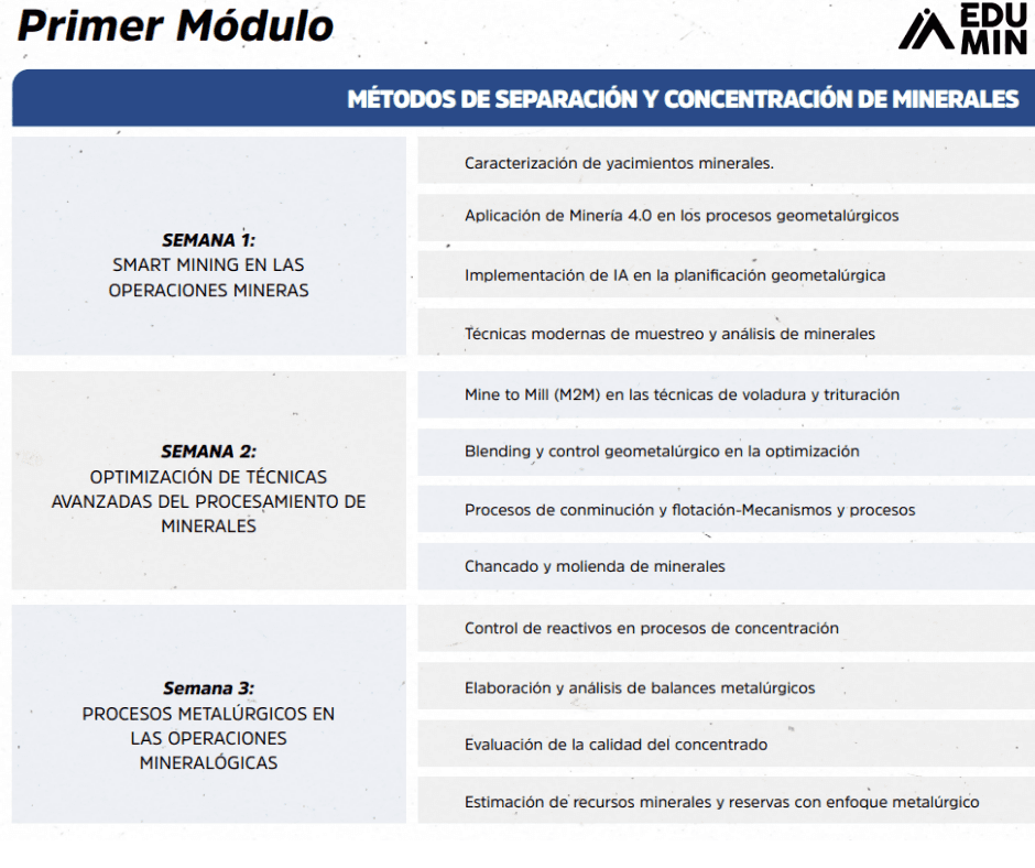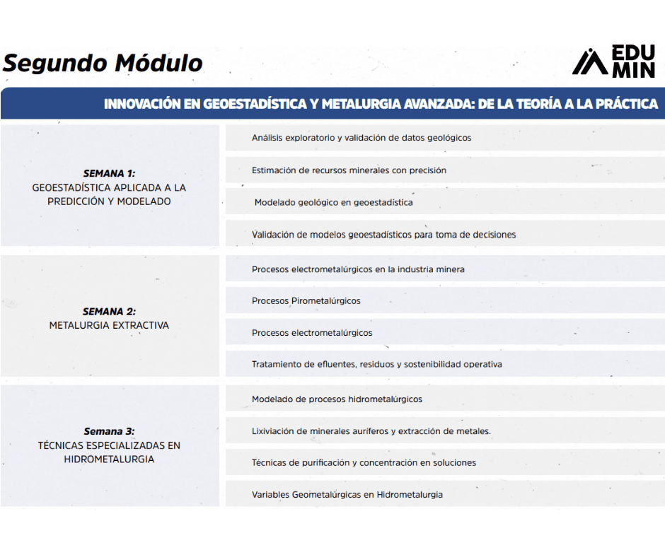 Nuestro Diplomado de Alta Especialización en Geometalurgia te prepara para optimizar cada etapa del proceso minero, desde la caracterización del yacimiento hasta la concentración de minerales. Aprenderás a aplicar herramientas de Minería 4.0 e Inteligencia Artificial en la planificación geometalúrgica, y convertirás la eficiencia operativa en una verdadera ventaja competitiva.